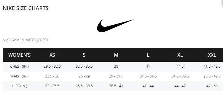 • Fit: Women's Nike Game and Limited Jerseys have a Standard Fit. The athletic-cut is fitted in bust, shoulders and arms. Jersey does not fit or feel like a T-shirt. If you are in between sizes, we recommend ordering one size larger than you normally wear.